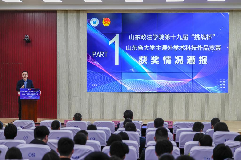 会上,贾俊涛宣读了《山东政法学院第十九届“挑战杯”山东省大学生课外学术科技作品竞赛获奖情况通报》,获奖师生代表依次上台领奖。