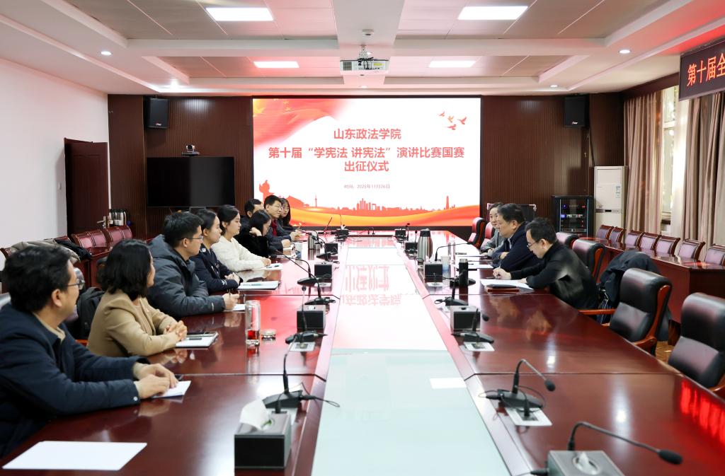 11月26日,第十届“学宪法 讲宪法”演讲比赛国赛出征仪式在鼎山楼第二会议室举行。学校党委委员、副院长蒋海升出席仪式并讲话,经济贸易法学院、警官学院相关领导、指导教师及参赛选手参加仪式。仪式由校团委书记贾俊涛主持。