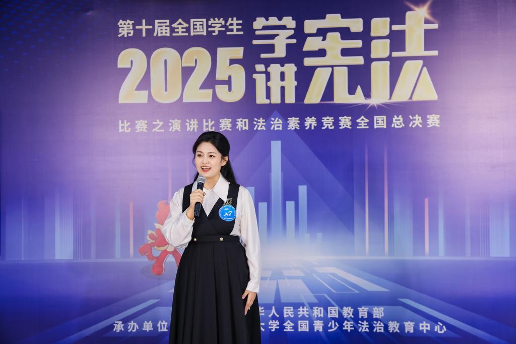 本次全国总决赛设置主题演讲和即兴演讲两个环节。其中,童予人同学分别以《以文化之韵传宪法之光,以青年之声扬法治之道》《运动点燃青春炬火,体育铸就强国基石》为题,将宪法精神与越剧文化艺术、体育事业发展巧妙融合,深入阐释了法治建设与中华优秀传统文化、体育强国建设之间相辅相成、互为滋养的关系。于菁同学则以《以宪法为纲,铸时代华章》为题,将警校生的法治信仰与青春追求同宪法精神紧密联结,深刻探寻源自宪法的时代伟力。两位同学的演讲逻辑严密、语言生动、内容翔实,不仅充分展现出新时代大学生对宪法的尊崇和热爱,更是山东政法学院重视宪法教育、培养高素质法治人才的生动体现。