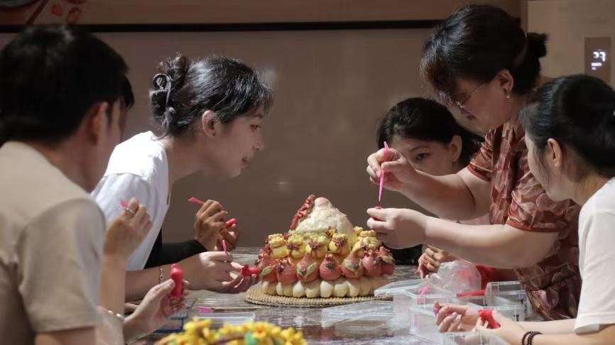 寻根叩来路,承脉焕新声。实践队踏访彭氏菜根香非物质文化遗产传承基地,领略农耕文化和非遗文化的独特魅力。实践队员在非遗传承人指导下亲手制作胶东花饽饽,体验非遗面塑工艺。队员精心打磨作品的同时,深刻感悟到踏实肯干、精益求精的匠心理念,已经悄然浸润心田。