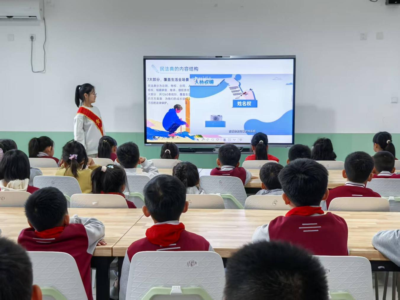 宣讲过程中,大学生法治辅导员充分考虑小学生的认知特点,避开晦涩难懂的法律条文,转而以“校园生活”“家庭日常”为切入点,用生动案例解读《中华人民共和国民法典》。从“小学生能否自己购买贵重物品”的民事行为能力问题,到“如遇遭受他人言语侮辱怎么办”的名誉权保护知识,再到“网络充值、游戏消费中的权益保护”等热点话题,法治辅导员们通过“案例讲解+提问互动”的方式,引导同学们主动思考、踊跃举手、积极抢答,让法律知识自然融入生活场景,将活动推向高潮。