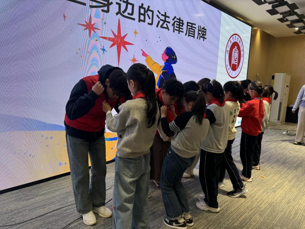互动环节尾声,少先队员代表为大学生法治辅导员佩戴鲜艳的红领巾。这一举动不仅体现了少年儿童对普法工作的真诚认可,更象征着社会主义法治精神在新时代青少年中的传承与弘扬,为活动注入了深厚的育人内涵。