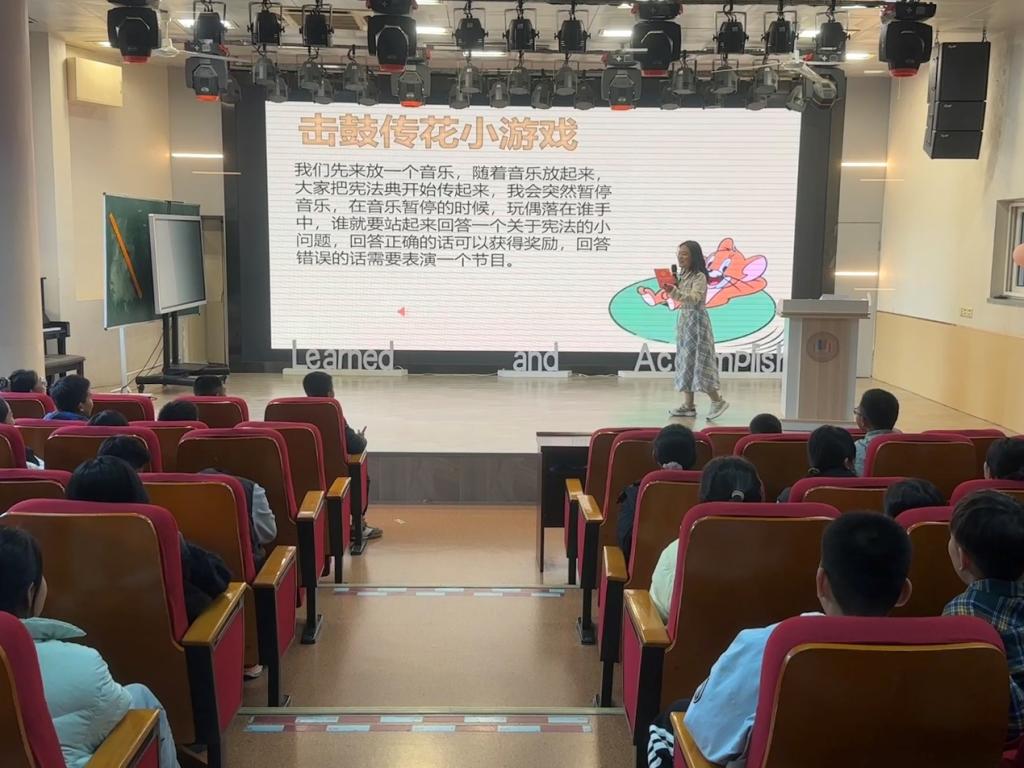 为深化理解,活动特设多个宪法主题互动游戏。法词连连看游戏,宣讲团队将“受教育权”“人身自由权”等宪法词汇融入游戏规则,让学生们在趣味竞技中掌握核心概念。模拟法庭游戏,学生分别扮演法官、原告、律师等角色,模拟一场围绕校园欺凌的小型庭审。通过沉浸式参与,学生们不仅了解了司法程序,更深刻体会到宪法如何通过具体制度保障每个人的权利。