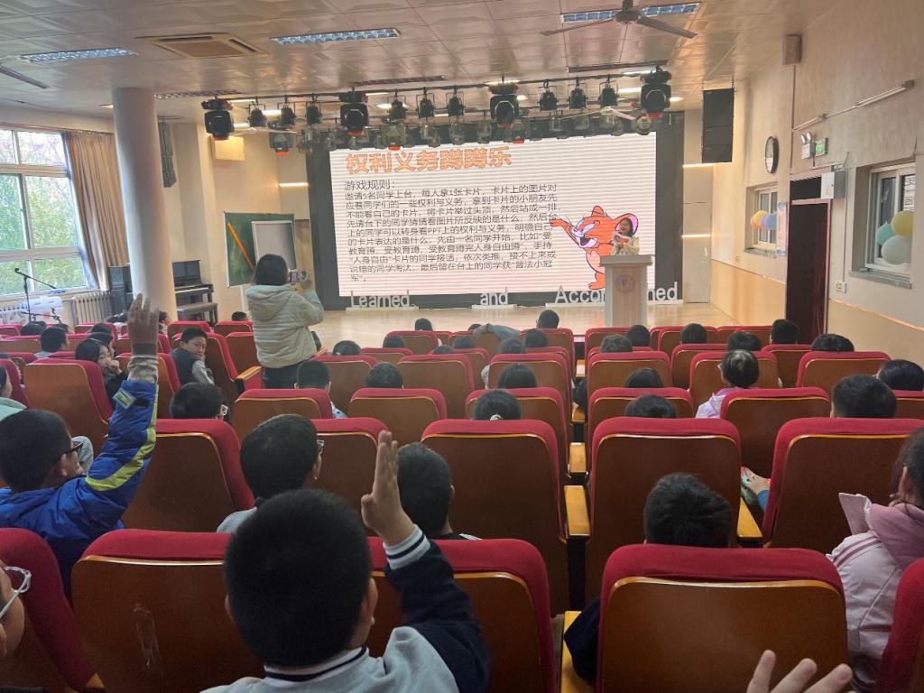 活动还设置了击鼓传花游戏,在鼓声中一本《宪法》读本在学生间传递。鼓声停止时,手持读本的学生随即抽取并回答一道与生活紧密相关的宪法知识题。权利义务蹲蹲乐游戏,学生们持有写着不同宪法权利与义务的卡片,如 “劳动权” “维护国家统一”等,围成一圈进行趣味接力。在有趣的游戏中,学生们生动理解了权利与义务相伴相生的宪法精神。