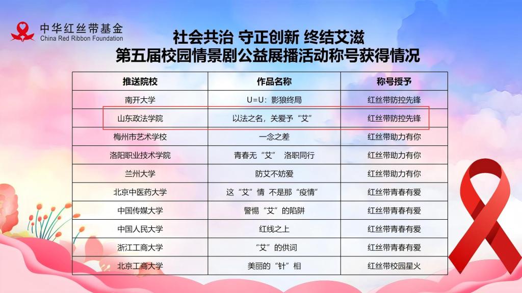 中华红丝带基金是由全国工商联和20余家会员企业共同倡议发起筹建的致力于艾滋病预防和控制工作的全国性公益基金组织。2021年,中华红丝带基金面向全国高校开展校园情景剧公益展播活动,至今已举办五届。
