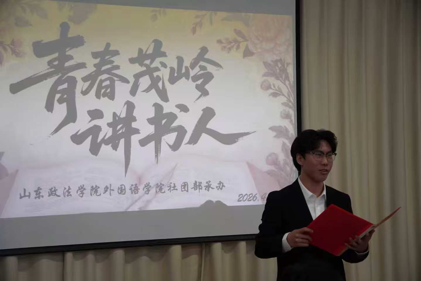 为深入践行全民阅读理念,扎实推进“文化山政”建设,引导青年学生在阅读中增长智慧、在分享中展现风采,2026年4月10日下午,外国语学院在尚德楼520教室举办首届“青春茂岭讲书人”活动。本次活动由学院党委副书记、副院长苏晓轶,辅导员张庆伟、卢博和学生会社团部负责人苗馨方担任评委,与现场同学共同聆听书香故事,感受文字力量。